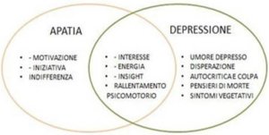 Se l’apatia condivide con la depressione la perdita di interesse, di energia, di insight ed un generico rallentamento psicomotorio, se ne distingue per la presenza specifica di indifferenza, ridotta motivazione e iniziativa e per l’assenza di altri sintomi tipici di un quadro depressivo come senso di impotenza, inutilità e mancanza di speranza (vedi immagine sottostante).